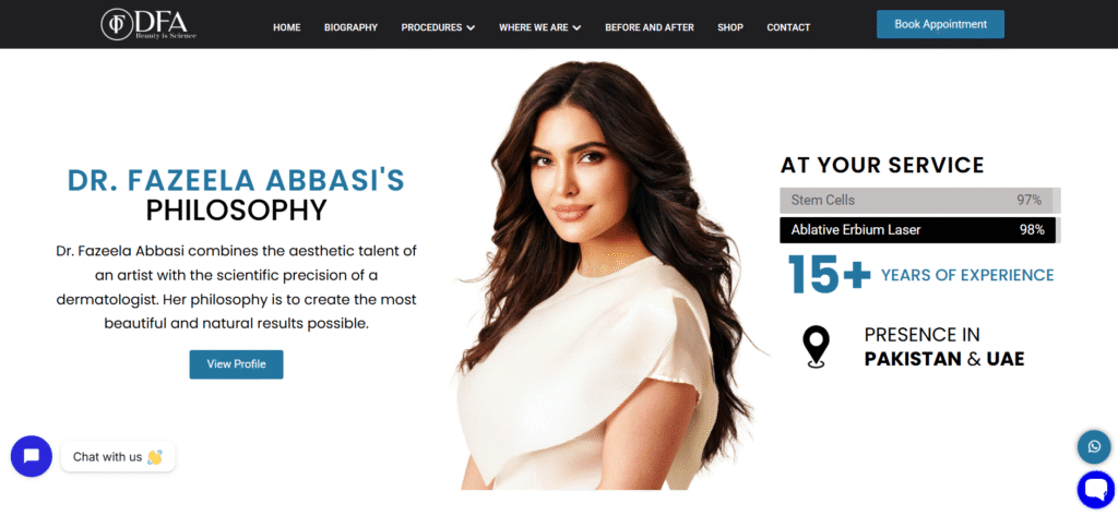 Dr. Fazeela Abbasi is known for combining the artistic sense of aesthetics with the scientific precision of dermatology. The homepage redesign needed to reflect her philosophy — beauty, science, trust, and professionalism. The new layout was crafted with a clean structure, elegant typography, and visually rich content to highlight her expertise and services.