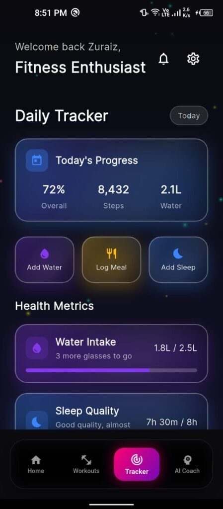FitPulse is a modern fitness & wellness app designed to help users track their daily health goals and stay consistent with healthy habits.